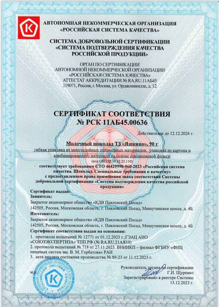 Роскачество подтвердило: молочный шоколад «Яшкино» (выпускается фабрикой «КДВ Павловский Посад») отвечает самым высоким требованиям.